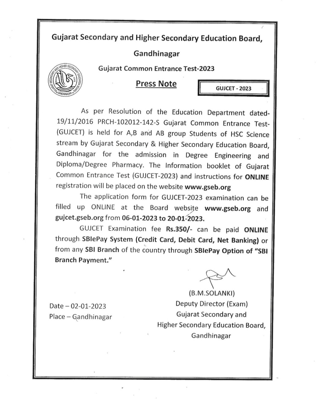 ગુજરાત માધ્યમિક અને ઉચ્ચતર માધ્યમિક શિક્ષણ બોર્ડ -ગાંધીનગર દ્વારા ડીગ્રી એન્જીનીયરીંગ ,ડીગ્રી/ડીપ્લોમાં ફાર્મસી અભ્યાસક્રમોમાં પ્રવેશ મેળવવા માંગતા A, B, અને ABગ્રુપના HSC વિજ્ઞાન પ્રવાહના ઉમેદવારો માટે ગુજરાત કોમન એન્ટ્રન્સ ટેસ્ટ ( ગુજકેટ) 2023 પરીક્ષા માટેની ઓન લાઈન આવેદન ભરવાની સૂચનાઓ બોર્ડની વેબસાઇટ www. gseb.org પર મુકવામાં આવેલ છે. વિદ્યાર્થીઓ www.gseb.org અને gujcet.gseb.org વેબસાઇટ પરથી ઓનલાઇન ફોર્મ ભરી શકશે. આ ફોર્મ ભરવા માટે 350 રૂપિયા ફી રાખવામાં આવી છે.
