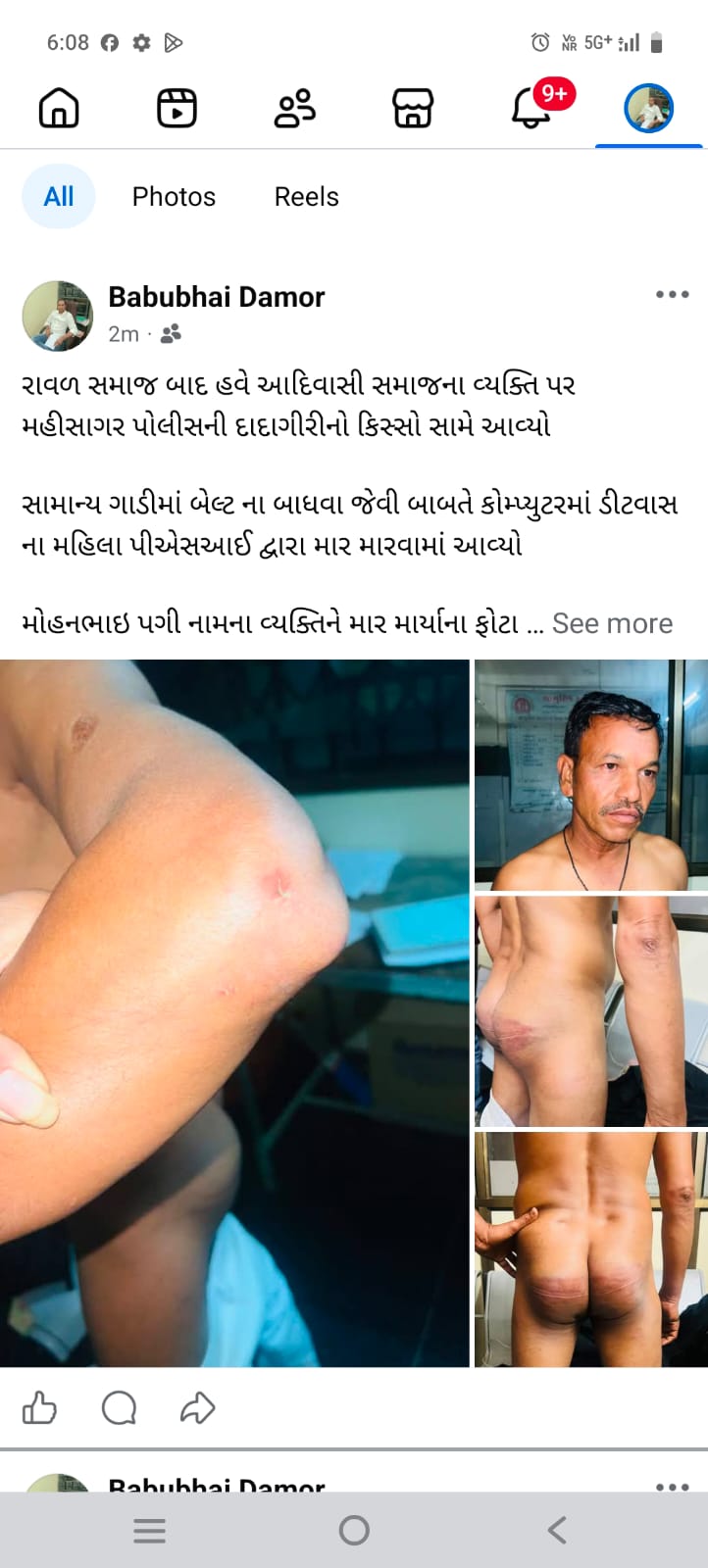 ગાડીમાં માત્ર સીટબેલ્ટ ના પહેરવાના મુદ્દે , ડિટવાસના મહિલા PSI દ્વારા માર મારવાના આક્ષેપો થયા હતા . ભોગ બનનાર વ્યક્તિનું નામ છે , મોહન પગી. જેમને માર માર્યાના ફોટોસ હવે સોશ્યિલ મીડિયામાં ખુબ જ વાઈરલ થઈ રહ્યા છે. મહીસાગર પોલીસની કામગીરી સતત પ્રશ્નાર્થ ઉભા કરી રહી છે. કેમકે , તે અગાઉ પોલીસ દ્વારા રાવળ સમાજના વ્યક્તિ પર માર માર્યાના ગંભીર આક્ષેપો થયા હતા.