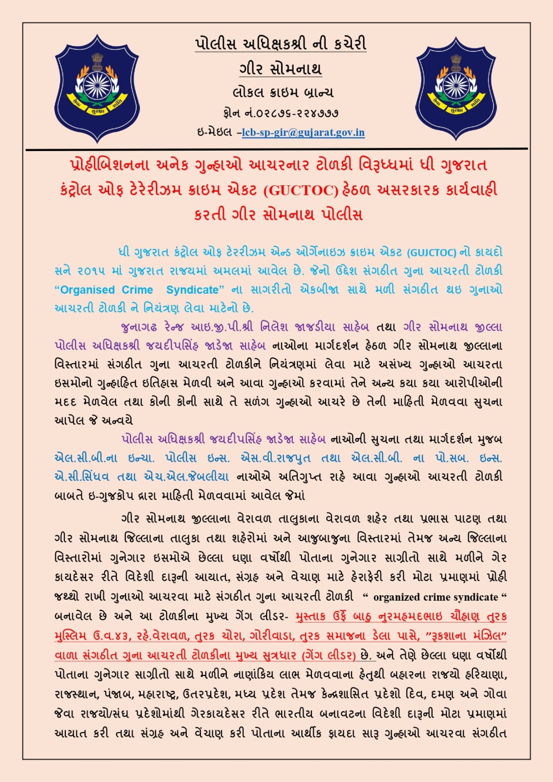 ગીર સોમનાથના SP જયદીપસિંહ જાડેજા દ્વારા જિલ્લામાં સંગઠિત ક્રાઇમની સામે ગુજસીટોકનું શસ્ત્ર ઉગામવામાં આવ્યું છે. જિલ્લાના વેરાવળ તાલુકા , પ્રભાસ પાટણ તથા જિલ્લાના અન્ય વિસ્તારોમાં જે ગુનેગારોએ તેમના સાગરીતો સાથે મળીને છેલ્લા ઘણા વર્ષોથી ગેરકાયદેસર રીતે , વિદેશી દારૂની આયાત , સંગ્રહ અને હેરાફેરી કરી હોય સાથે જ સંગઠિત ગુના આચરેલા છે એ ટોળકીના આઠ આરોપીઓની સામે વેરાવળ સીટી પોલીસ સ્ટેશન ખાતે GUJSITOK હેઠળ વિવિધ કલમો હેઠળ ગુનો નોંધવામાં આવ્યો છે. આ ટોળકીનો મુખ્ય સૂત્રધાર મુસ્તાક ઉર્ફે બાથુ નુરમહંમદભાઈ ચૌહાણ છે અને તેના અન્ય સાત સાગરીતોની સામે SP જયદીપ જાડેજા દ્વારા કડક કાર્યવાહી કરવામાં આવી છે. જેમાંથી ચાર આરોપીઓને પકડી પાડવામાં આવ્યા છે જયારે , અન્ય ચાર આરોપીઓ હાલમાં પ્રોહિબિશનના ગુનાઓમાં જેલમાં છે. આ કેસની આગળની તપાસ DYSP વેરાવળ દ્વારા કરવામાં આવશે. મુખ્ય સૂત્રધાર મુસ્તાક ઉર્ફે બાથુ નુરમહમંદ ચૌહાણ દ્વારા ઘણા વર્ષોથી પોતાના ગુનેગાર સાગરીતો સાથે મળીને બહારના રાજયો હરિયાણા,રાજસ્થાન, પંજાબ,મહારાષ્ટ્ર, ઉત્તરપ્રદેશ,મધ્ય પ્રદેશ તેમજ કેન્દ્રશાસિત પ્રદેશો દીવ.દમણ અને ગોવા જેવા રાજયો/સંઘ પ્રદેશોમાંથી ગેરકાયદેસર રીતે ભારતીય બનાવટના વિદેશી દારૂની મોટા પ્રમાણમાં આયાત કરવામાં આવી છે સાથે જ આ ટોળકી દ્વારા અન્ય સંગઠિત ગુનાઓ પણ કરવામાં આવ્યા છે.