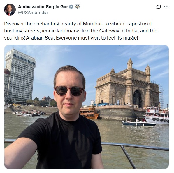ભારતના રાજદૂત તરીકે તાજેતરમાં નિમણૂક થયેલા સર્જિયો ગોર તેમની મુંબઈની પ્રમુખ મુલાકાત માટે આવ્યા છે. તેમણે અહીં ઐતિહાસિક ગેટવે ઓફ ઈન્ડિયામાં પહોંચી અને ત્યાંથી એક સેલ્ફી પોસ્ટ કરતા કહ્યું કે “મુંબઈનો જાદુ અનુભવવા દરેકને આવવું જોઈએ.”